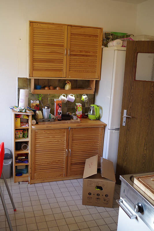Mittags holen wir ihre Schwester Marieke vom U-Bahnhof Garstedt ab. Der ist direkt im Herold-Center in Norderstedt. Ein kurzer Weg. Marieke ist begeistert vom Haus und von der Gegend. Das beruhigt auch Kathinka und die beiden verbringen einen unbeschwerten Tag. Ich nutze die freie Zeit um den Hängeschrank für die Küche fertig zu stellen. Ist zwar eine recht schiefe Bretterkiste, erfüllt aber ihren Zweck. Ich kann sogar die Unterbauleuchte aus der alten Wohnung wiederverwenden. Auch beim Mittag bin ich ruhiger und stürze nicht sofort nach dem Essen wieder los. Abends möchte ich noch ne Ladung aus dem Lagerhaus holen, daher räume ich zunächst den Anhänger aus. Dann krabble ich zum ersten Mal überhaupt auf den Dachboden und checke die Lage. Tatsächlich gibt es keine Unterspannbahn. Aber dennoch scheint das Dach sehr dicht zu sein. Es sind keine feuchten Stellen oder Löcher zu finden. Die Sanierung sollte hier recht leicht sein. Ich schraube noch die alten Fernsehantennen ab und packe sie auf den Müllhaufen für Metall. Ein bisschen Spielen mit Erik an der Treppe und dann breche ich auch bald zum Lagerhaus auf. Unterwegs liefere ich Marieke ab und packe dann die verbliebenen Sachen in den Anhänger. Eine Ladung noch, dann ist das Lager leer.