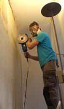 Kathinka und Erik wollen früh aufbrechen um mir bei der Arbeit nicht im Weg zu sein. Vorher hetze ich noch schnell zum Baumarkt und besorge Material für den Frettchenkäfig. Als ich dann allein im Haus bin, bereite ich endlich die Mauer für den Durchbruch vor. Zunächst muss oben eine komplette Reihe Steine weg. Ich hoffe, meine Stützwände halten die Last aus. Der Grossteil der Steine lässt sich recht gut rauskloppen, nur hin und wieder ist ein hartnäckiger Kandidat dazwischen. Als ich oben einen breiten Durchgang über die gesamte Mauer erstellt habe, zeichne ich mit dem neuen Linienlaser die Stellen für die Säge an. Links und rechts soll vor dem Zertrümmern der Mauer jeweils eine einigermassen gerade Kante entstehen. Dafür hat mir mein Bruder seine neue Steinflex geliehen. Tatsächlich schneidet das Ding durch die Mauer als wäre sie aus Butter. Aber kurz nachdem ich den Schnitt gestartet habe, kann ich nichts mehr sehen. Das Ding produziert so einen feinen Staub, dass sich sämtliche Partikel wie Nebel durch die Luft bewegen. Obwohl das Steinmehl ist, denkt es garnicht daran sich zur Ruhe zu setzen, sondern wabert munter durchs gesamte Haus. Ich bin überrascht und schockiert. Kathinka wird mich töten. Überall im Haus steht Staubnebel in der Luft und überall schlägt sich eine feine Staubschicht nieder. Auf die Möbel, die Kleidung, die Küche, die Türen, die Lichtschalter, eben einfach überall. Und das nicht nur in unmittelbarer Nähe zur Wand sondern wirklich im gesamten Haus. Sogar im Obergeschoss finde ich eine feine graue Schicht auf dem Boden. Und hier waren alle Türen geschlosssen. Katastrophe! Ich bin kurz geschockt und überlege, ob ich sofort die Arbeit stoppen und mit dem Putzen starten soll. Aber das würde bedeuten, dass ich beim zweiten Schnitt nochmal Alles einsauen würde. Bevor ich den zweiten Schnitt aber machen kann, muss zunächst die halbe Mauer weg. Ansonsten hätte ich hier eine freistehende, tonnenschwere Wand mitten im Wohnzimmer, die beim kleinsten Windzug auf meine Familie kippen könnte. Ich beginne also mit dem Loskloppen der Steine. Und zum Glück geht das jetzt, wo oben keine Verbindung mehr besteht, recht gut. Zügig schlage ich Reihe um Reihe aus der Wand und türme draussen einen Haufen Ziegel auf. Der Schutt von Mörtel und Putz geht per Schaufel nach draussen. Bald ist die Wand diagonal abgebaut und ich kann den zweiten Schnitt machen. Ich weiss ja jetzt, was mich erwartet. Und nach ein paar Minuten ist die Staubschicht im gesamten Haus doppelt so dick. Was für ein Scheiss!